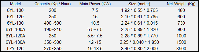 Types of small oil press machines Tech Parameters (capacity range 5~20 tons per day):